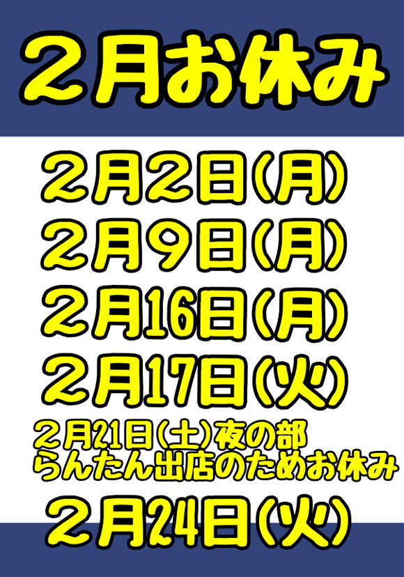 2月2(月)・9(月)・16(月)・17(火)・21(土※午後)・24(火)となります。