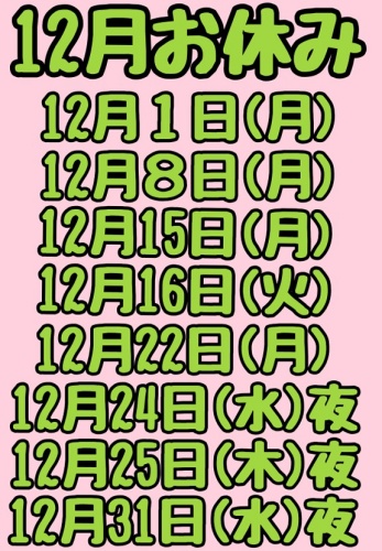 12月1(月)・8(月)・15(月)・16(火)・22(月)・24(水)・25(木)・31(木)